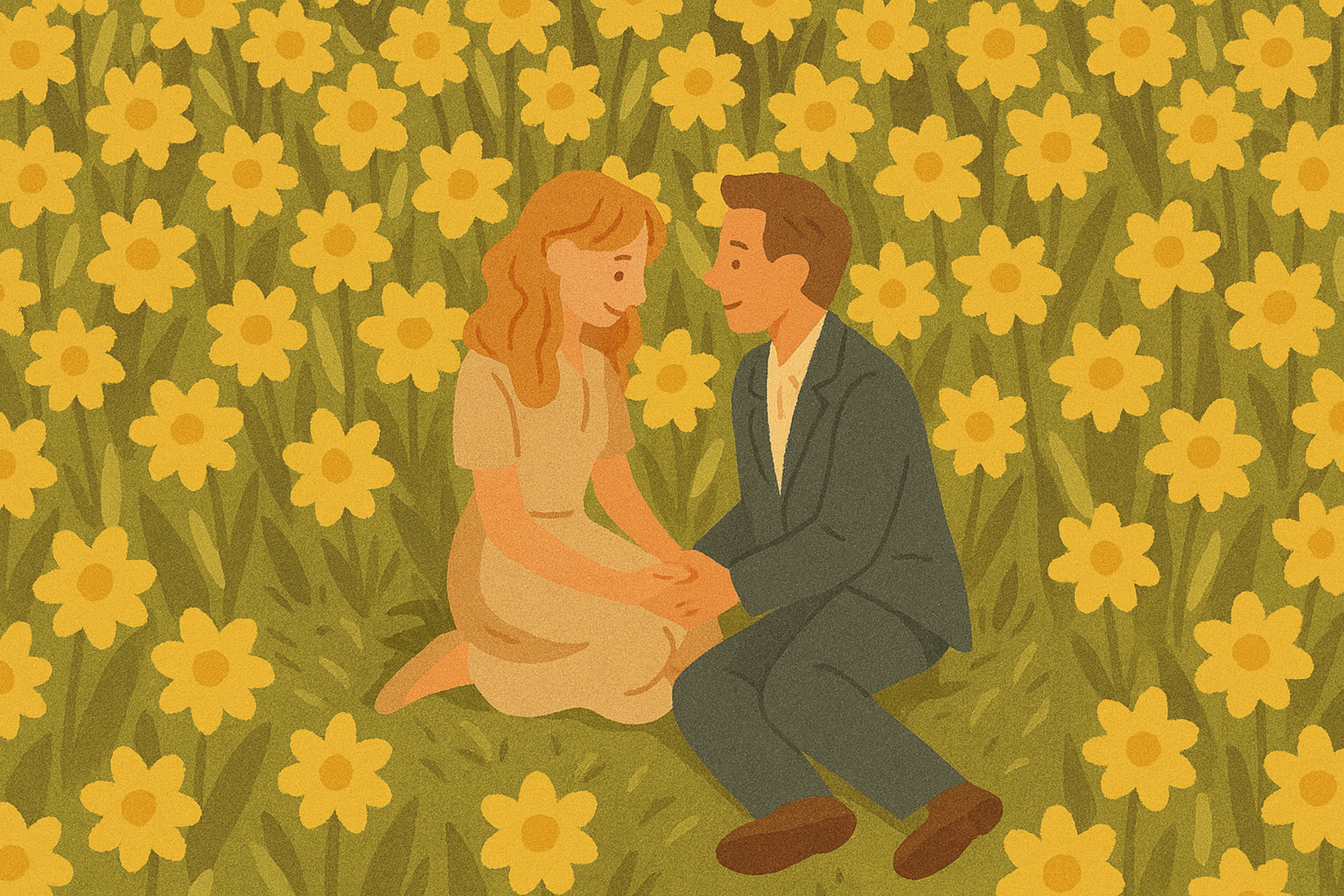 照明が円形に落ちるテント内で、時間がふっと止まるような視線の交差があります。わずかなスローモーションと色温度の高い光が「出会い」を祝福し、あなたの記憶にも初めてのまばたきがよみがえるように感じられます。