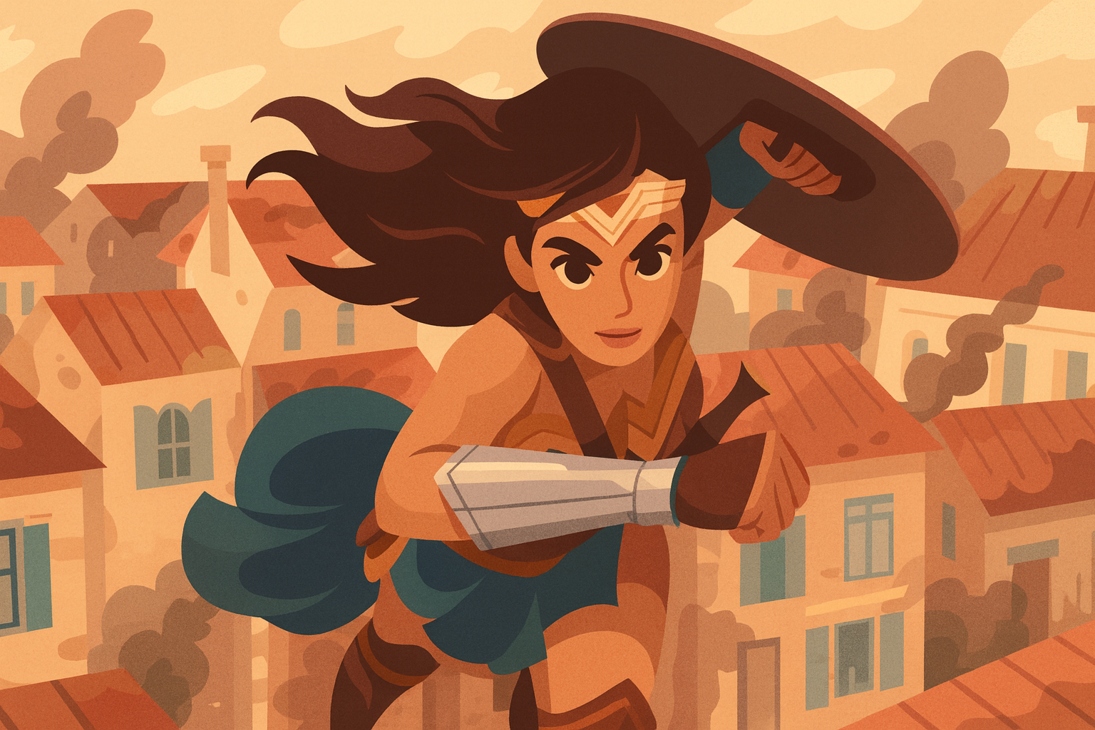 浜辺に敵が上陸し、アマゾン達が馬で応戦。水平線を背にしたロングで矢が弧を描き、ダイアナの初陣が切り取られる。砂の飛沫と盾の衝撃音が体感温度を上げ、「守るために立つ」感覚が観る者にも伝染する。